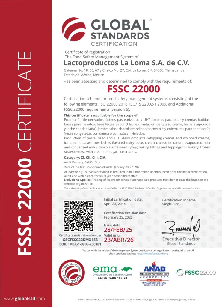Además, en abril de este año obtuvimos la certificación FSSC 22000, un estándar internacional que garantiza la calidad e inocuidad en todos nuestros productos.