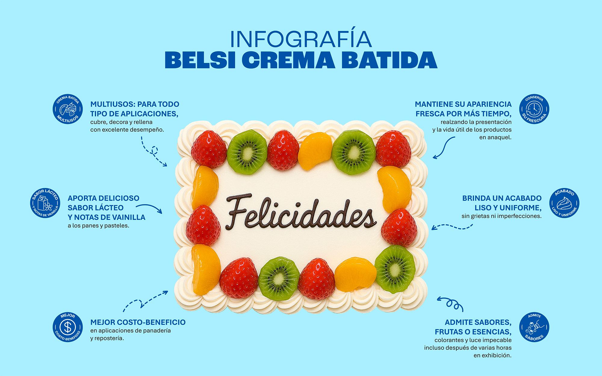Belsi® es la crema batida práctica y accesible diseñada para quienes buscan decorar, cubrir y rellenar postres, panes y pasteles con acabados profesionales, sabor agradable y alto rendimiento.