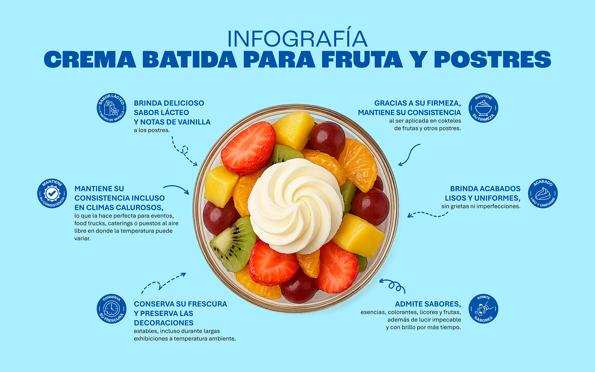 • Gracias a su firmeza, mantiene su consistencia al ser aplicada en cokteles de frutas y otros postres.