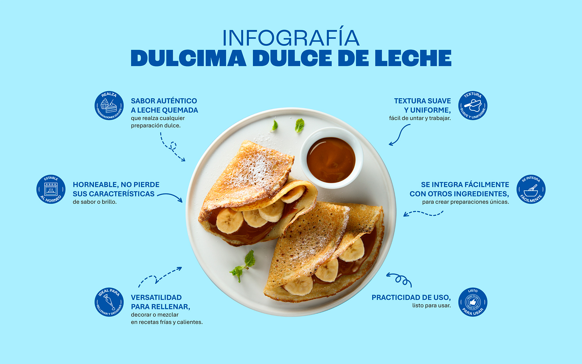 Dulcima® Dulce de Leche es la crema de leche quemada ideal para repostería y panadería profesional, perfecta para rellenar, cubrir o decorar pasteles, panes y postres.