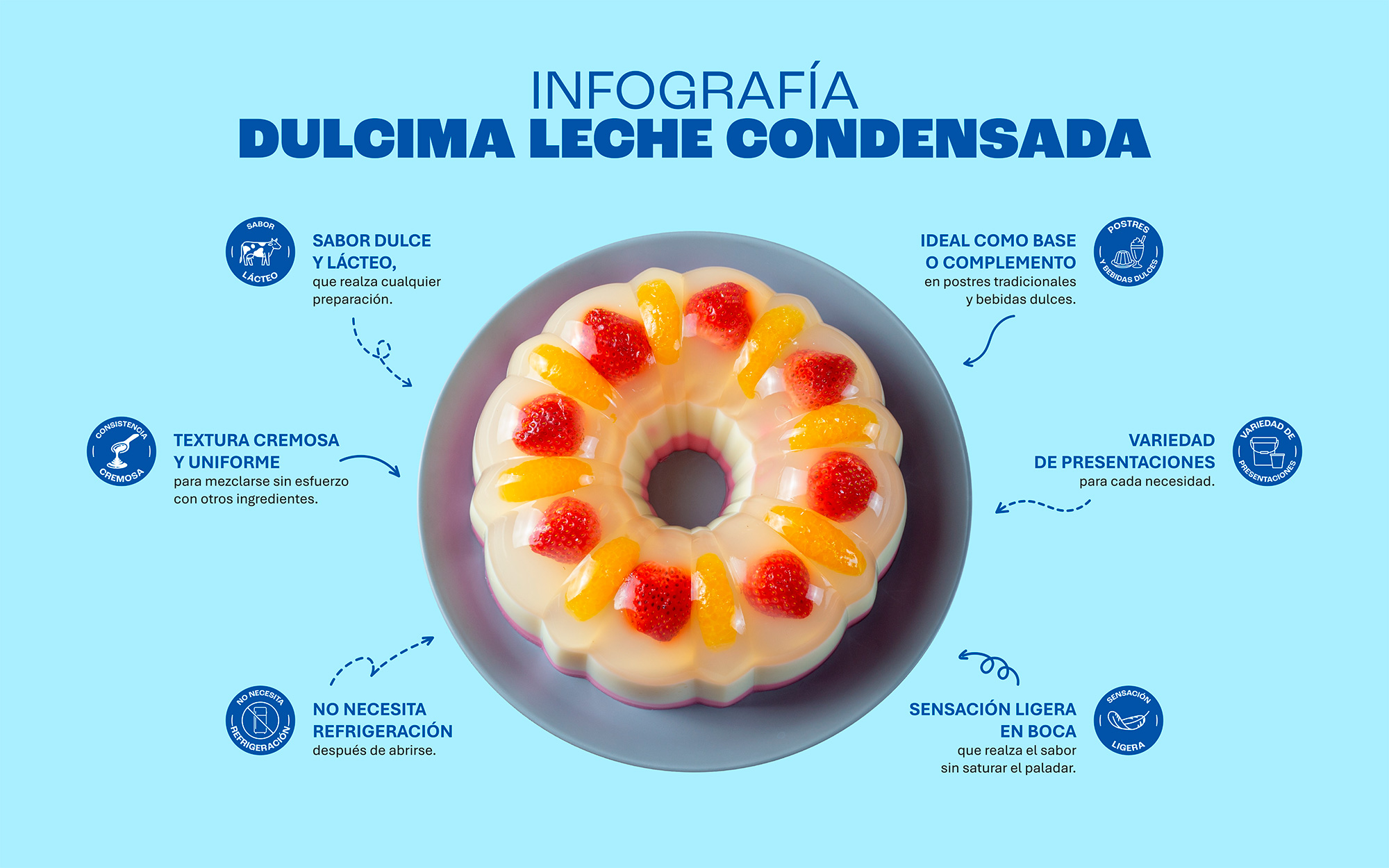 Dulcima® Leche Condensada es el ingrediente ideal para optimizar tu negocio. Su sabor lácteo y dulzor equilibrado son perfectos para realzar postres clásicos como flan, arroz con leche y gelatinas.