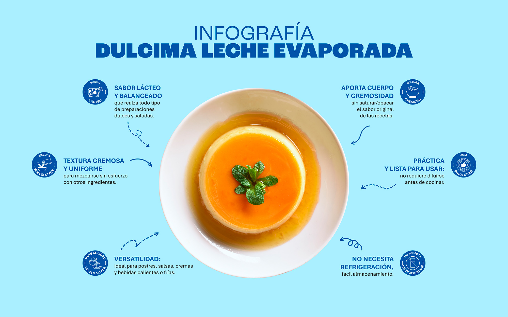 Dulcima® Leche Evaporada es un ingrediente clave para elevar el sabor y la textura de tus platillos. Su sabor lácteo balanceado y textura homogénea la hacen perfecta para postres como tres leches, flanes y gelatinas, así como para preparaciones saladas como cremas, salsas y gratinados.