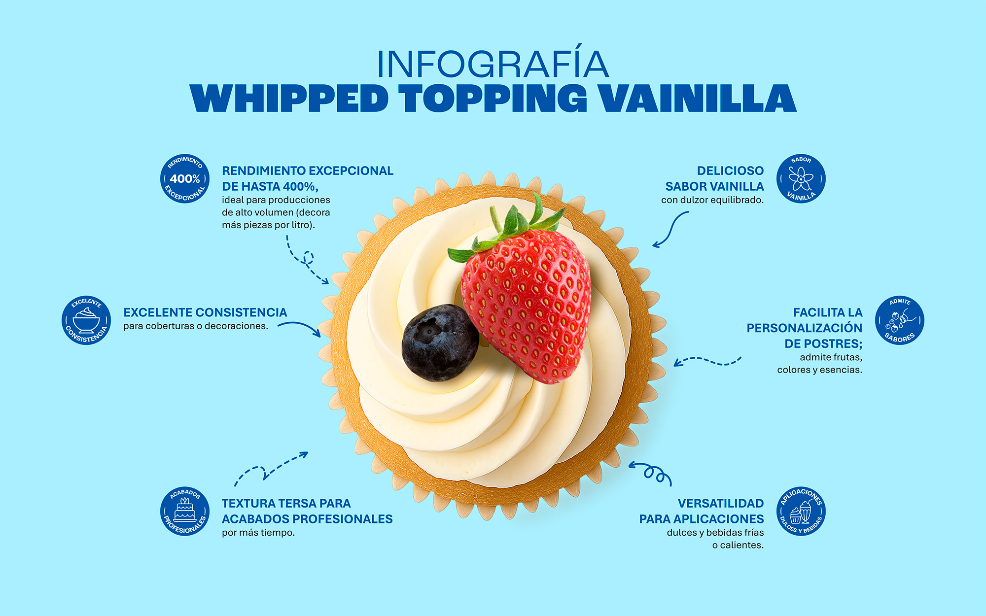 Dulcima® Whipped Topping es la crema batida lista para usar que combina alto rendimiento, estabilidad profesional y sabor suave a vainilla. Con una capacidad de expansión de hasta 400%, permite cubrir y decorar más pasteles con menor cantidad de producto, optimizando costos sin sacrificar calidad.