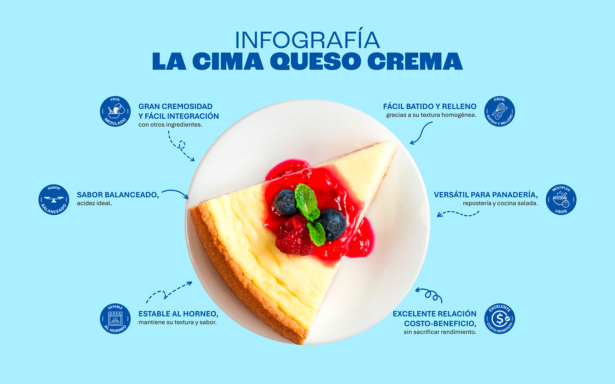 La Cima® Queso Crema es tu aliado creativo en la cocina, con textura cremosa y estable ideal para recetas dulces y saladas.