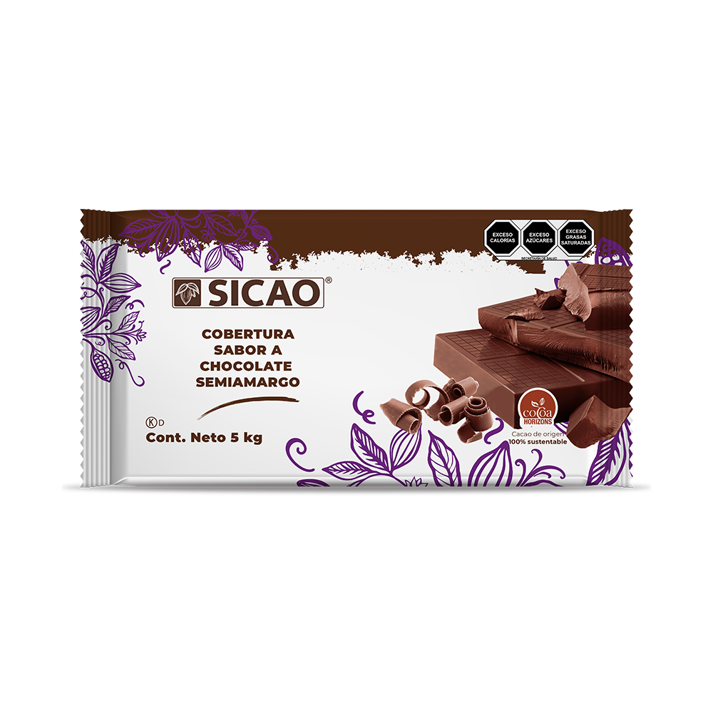 La marqueta SICAO es una cobertura sabor chocolate para repostería y panadería, disponible en semiamargo, leche y blanco.