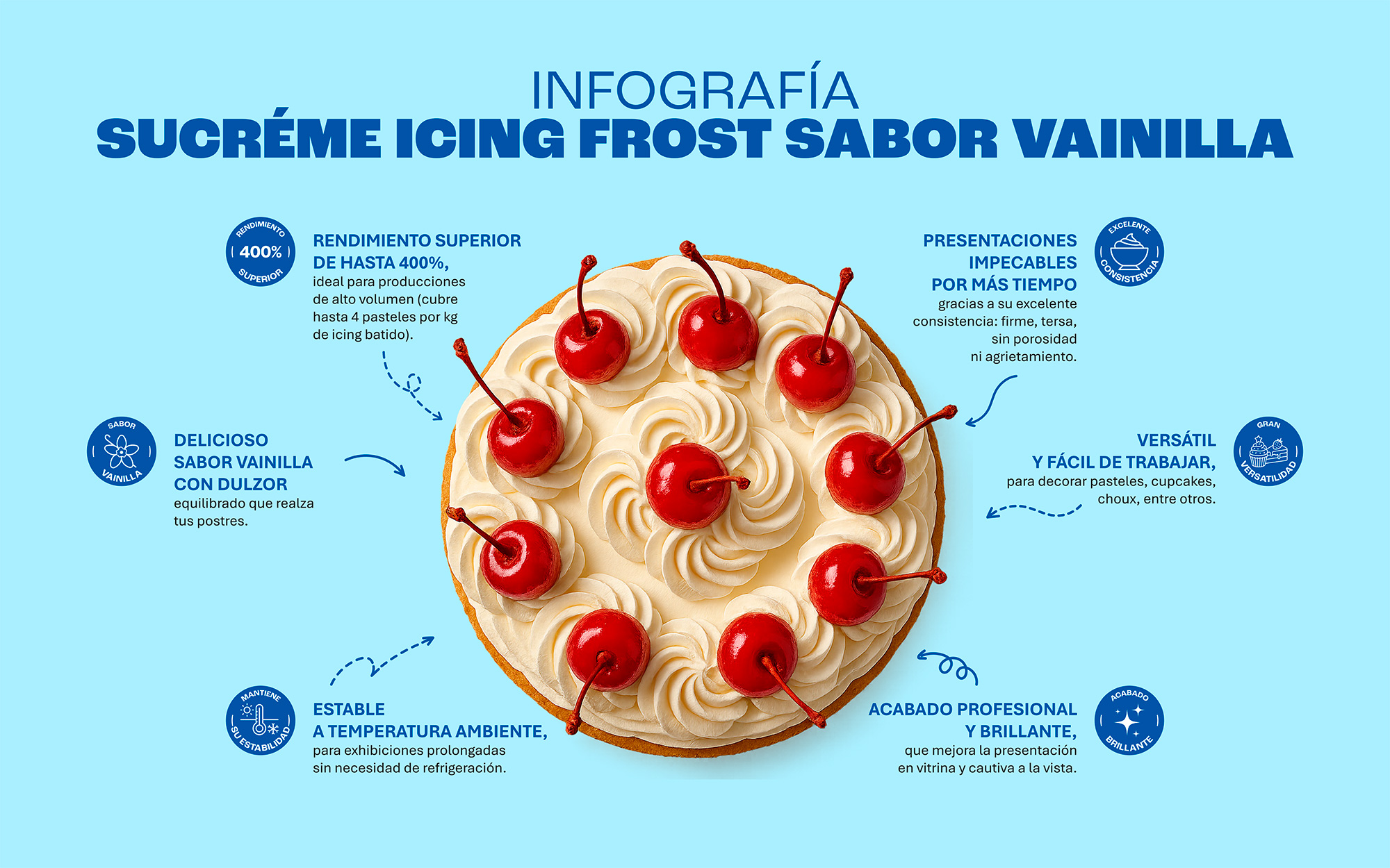 Sucréme® Icing Frost es la cobertura para repostería profesional que combina versatilidad, alto rendimiento (hasta 400%) y practicidad al estar lista para batir. Su estabilidad a temperatura ambiente (hasta 25 °C) la convierte en la aliada perfecta para exhibiciones prolongadas sin perder frescura ni presentación.